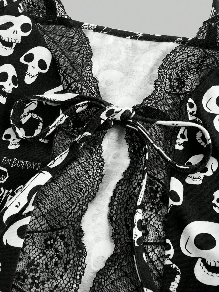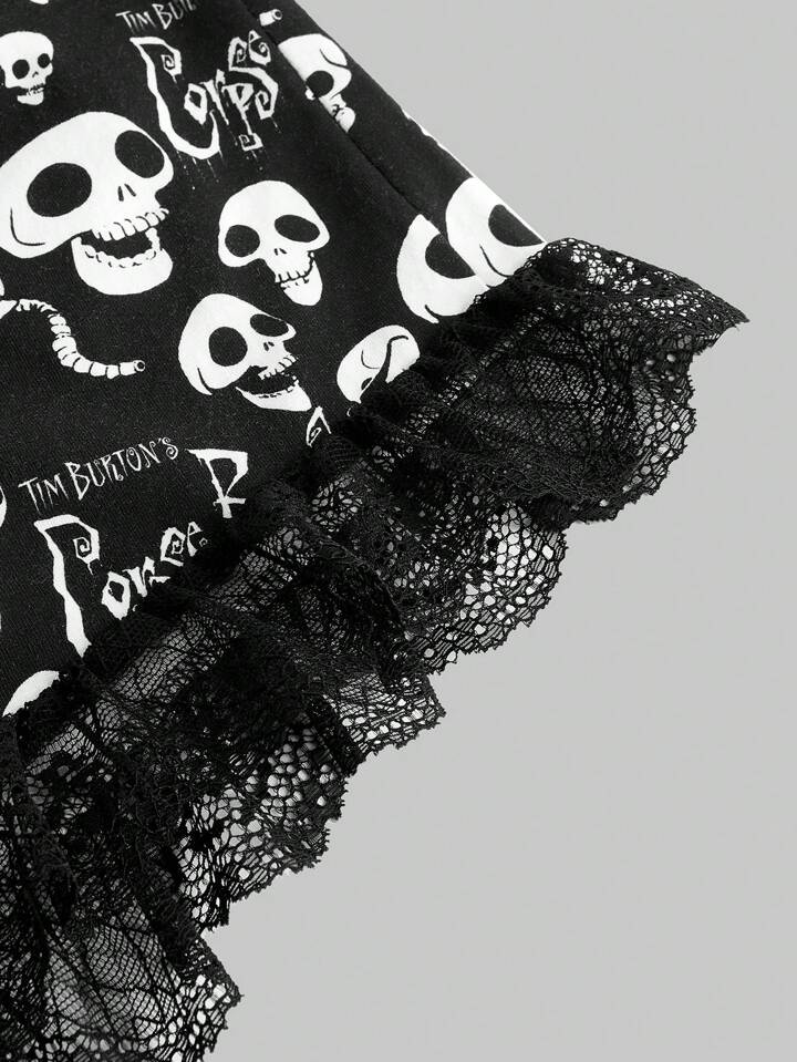 Corpse Bride | ROMWE Ensemble de pyjama avec débardeur à motif de crâne imprimé sur tout et short en dentelle, été, école