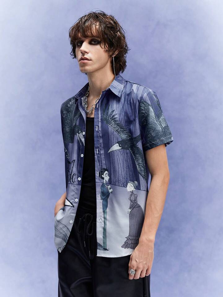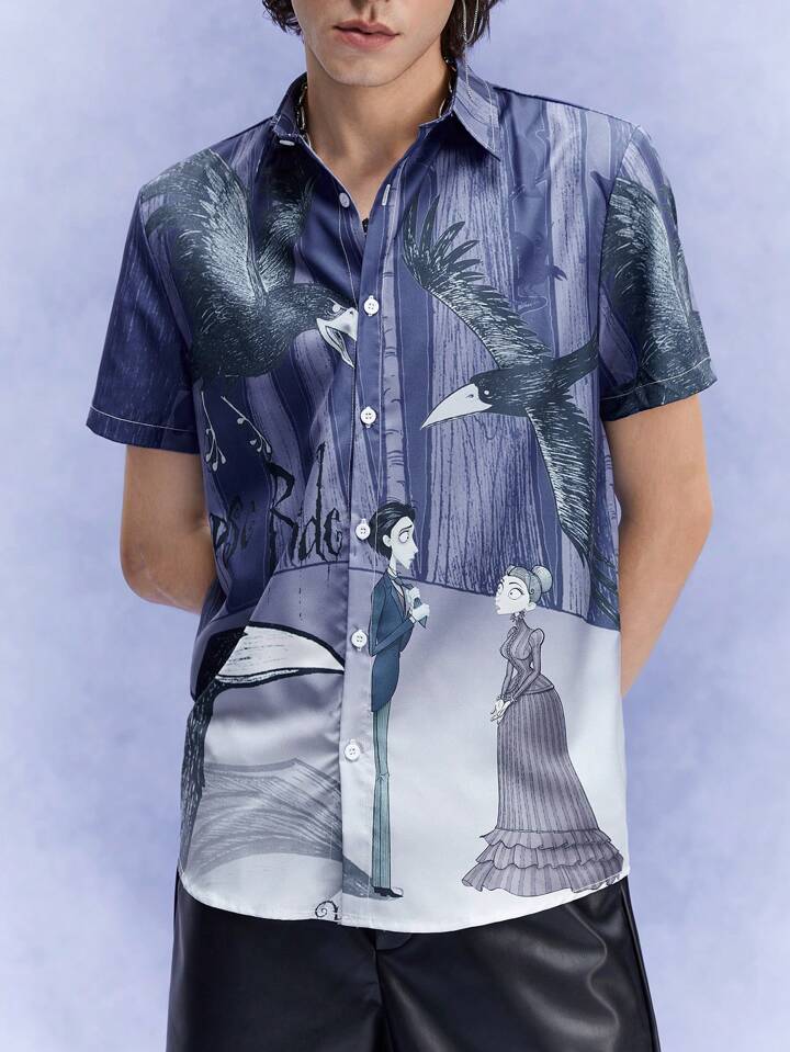 Corpse Bride | ROMWE Chemise à manches courtes imprimée de personnages de bande dessinée pour hommes, parfaite pour un port quotidien au printemps et en été, école