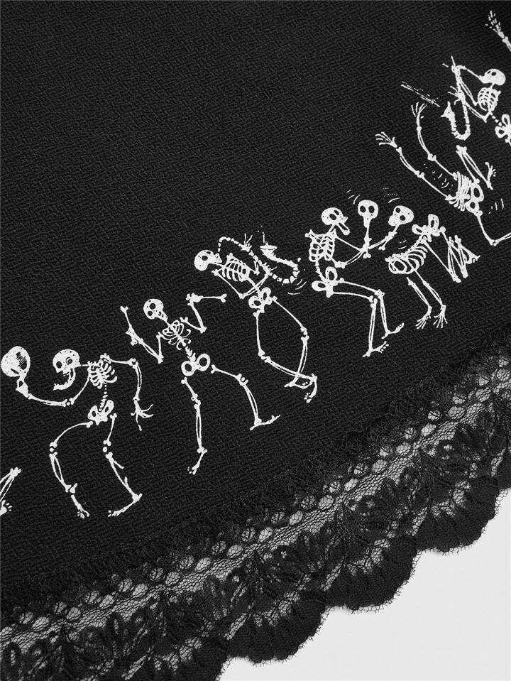 Corpse Bride | ROMWE Robe femme à col lavallière avec imprimé squelette en dentelle noire contrastée et design découpé, convient pour Halloween