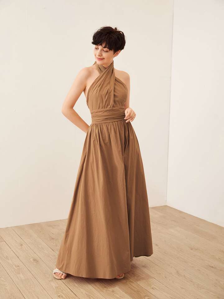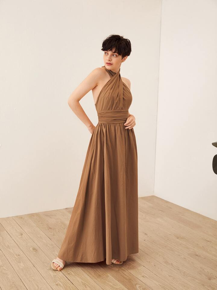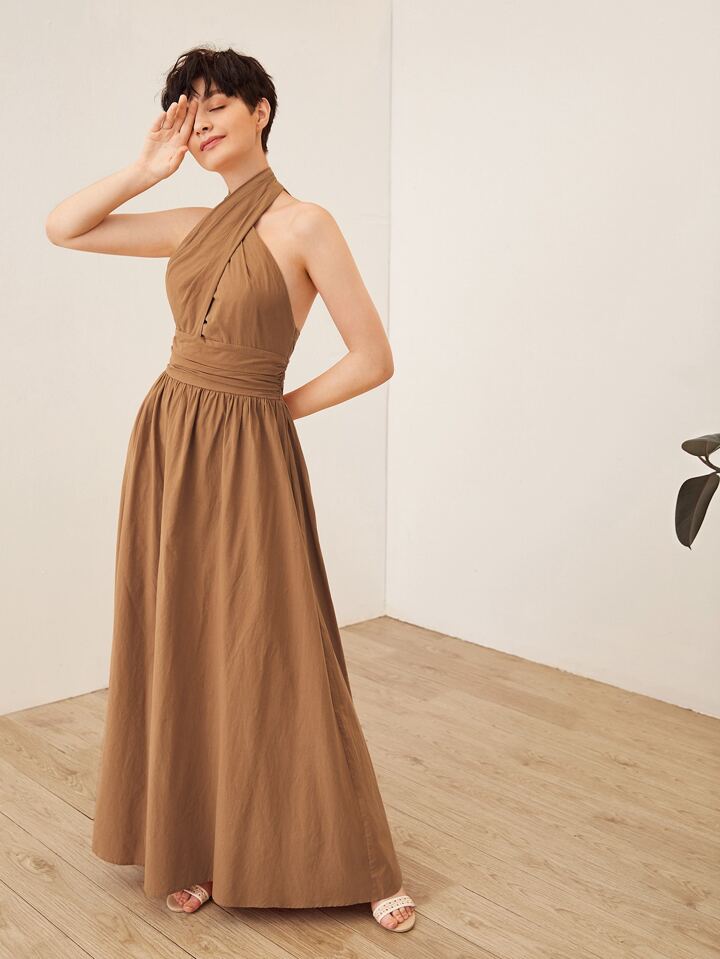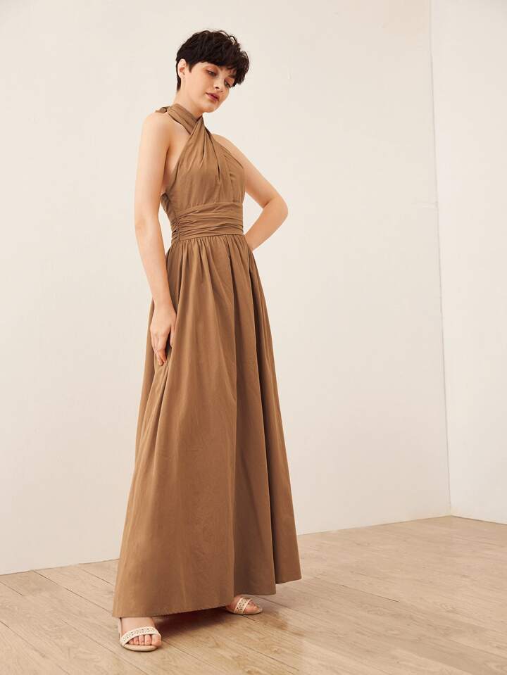 Robe avec croisé dans le dos, encolure en licou et taille froncée