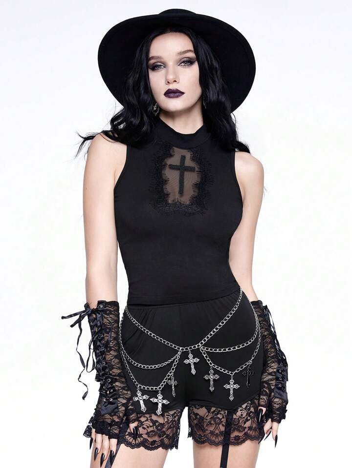 Top moulant type débardeur gothique sombre avec encolure ras-du-cou, appliqué en croix semi-transparent et garniture en dentelle