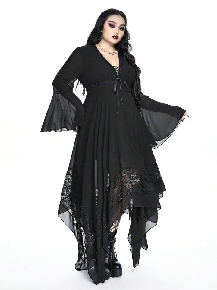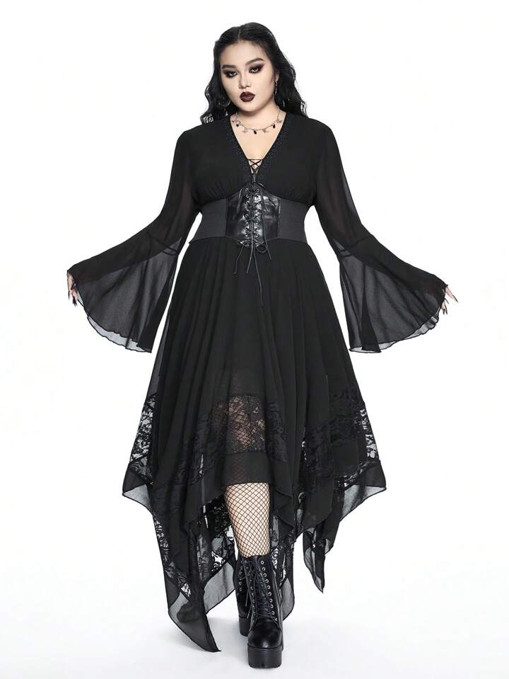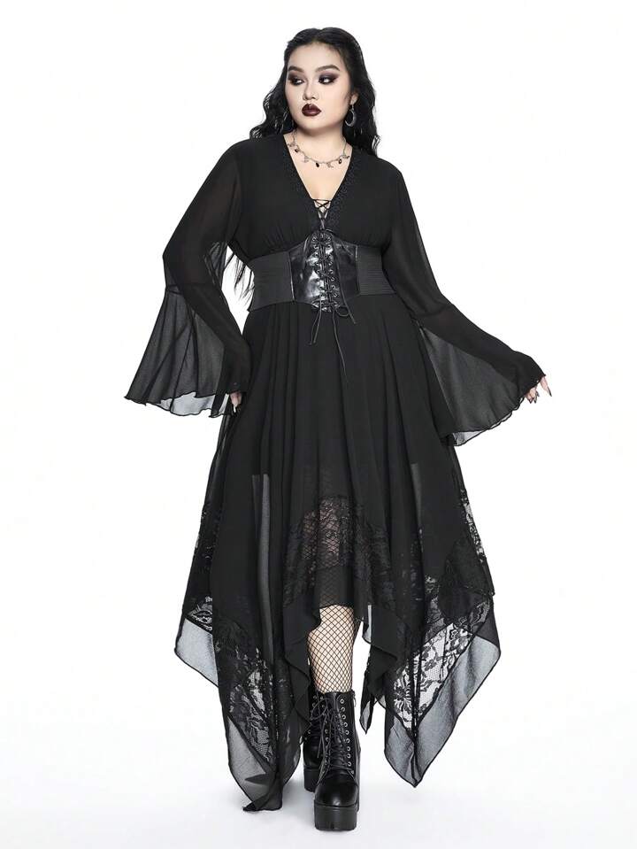 Robe gothique sombre à encolure V profonde, manches évasées, ourlet asymétrique, dentelle contrastée, taille cintrée pour grande taille