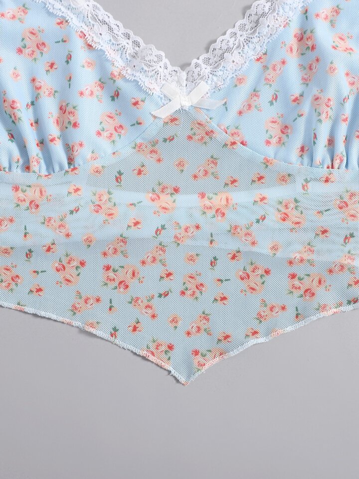 Top à fines brides fleuri avec dentelle