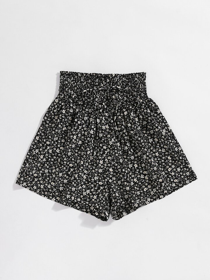 Short fleuri à plis froncé à nœud