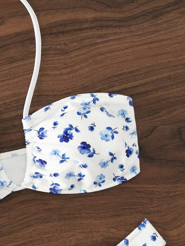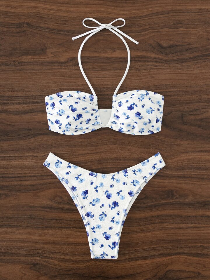 Ensemble bikini d'été à col ras-du-cou en fleurs Ditsy pour plage
