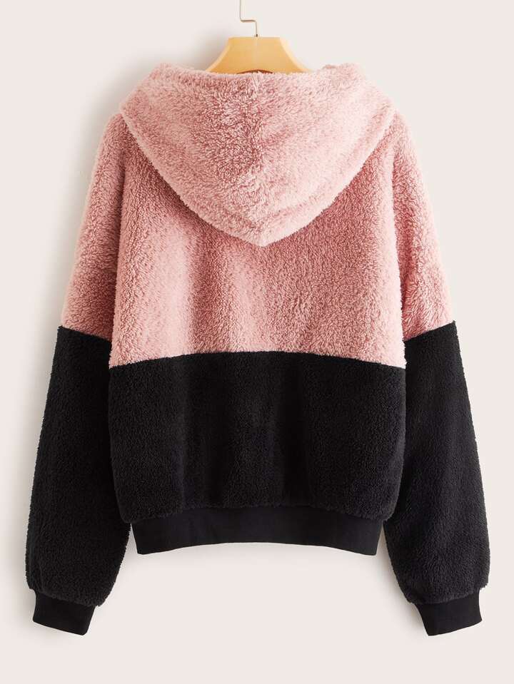 Pull à capuche duveteux avec blocs de coulé et cordon