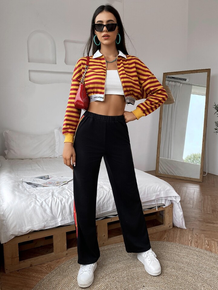 Sweat-shirt court à col contrastant à rayures zippé