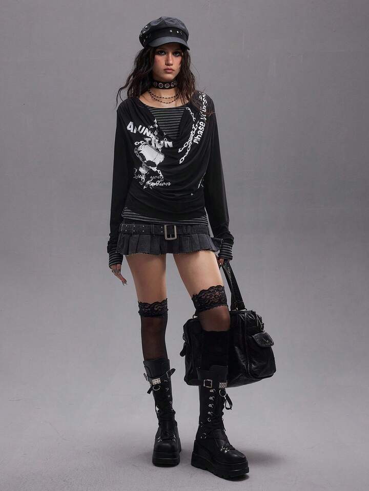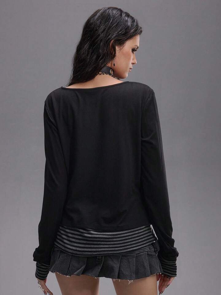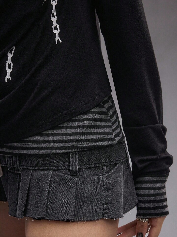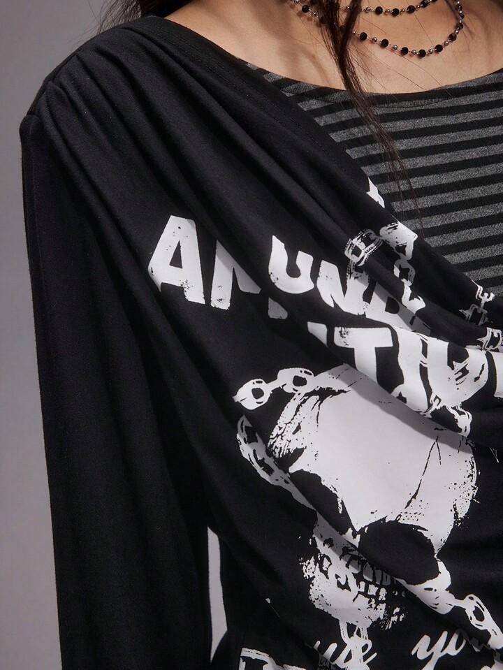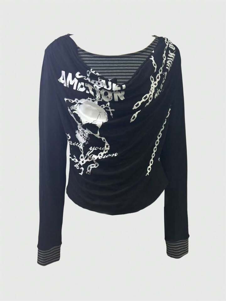 EDITION Chandail tricoté à manches longues pour femmes, avec chaîne de crâne universitaire, 2 en 1 superposé, drapé, rayé