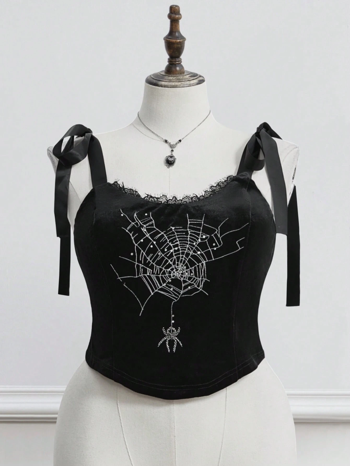 EDITION Débardeur à encolure carrée avec patchwork en dentelle, strass et motif de toile d'araignée gothique pour Halloween, grande taille pour femmes