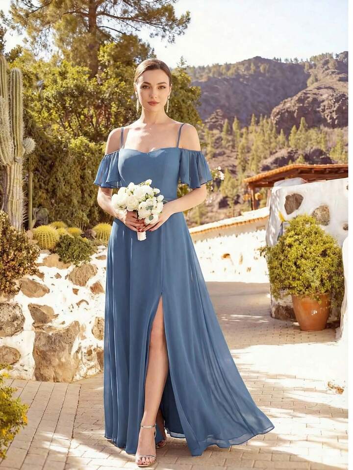 EVERPRETTY Robe de demoiselle d'honneur longue en mousseline de soie élégante avec épaules dénudées en bleu clair, convient pour les mariages, les remises de diplômes, le Nouvel An, la Saint-Valentin, les fêtes d'anniversaire