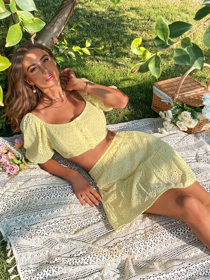 Blouse courte à broderie anglaise manches bouffantes & Jupe à volants