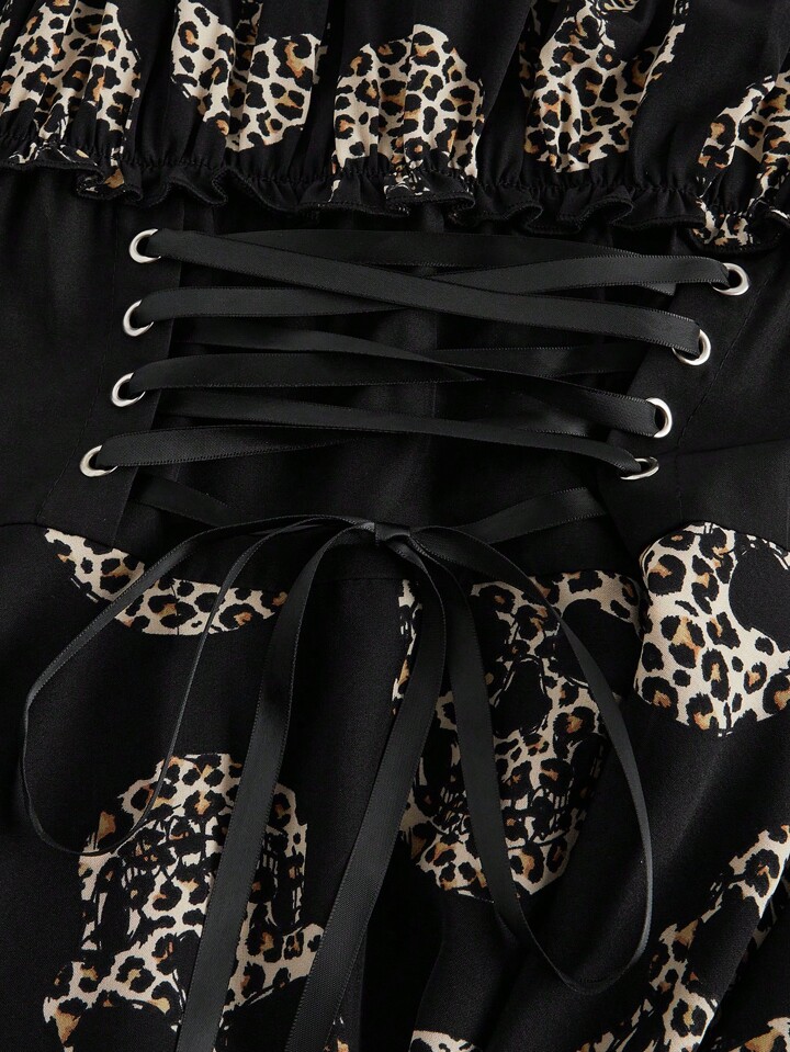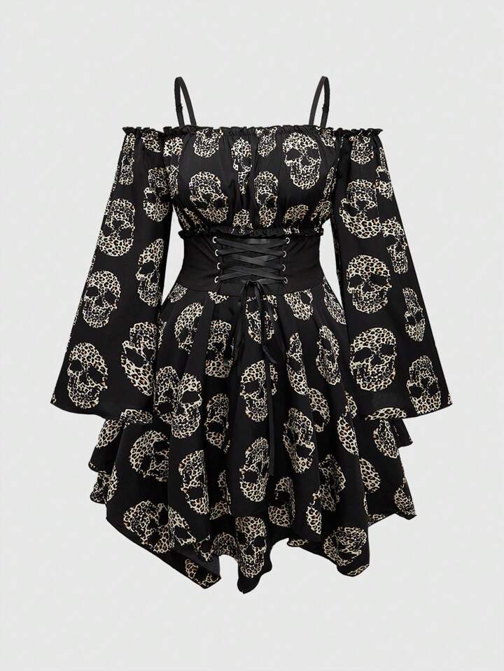 Fairycore 1 pièce Robe de grande taille pour femme à ourlet asymétrique avec nœud à la taille, imprimé floral tout-sur-sur avec lune, soleil, étoile et insecte, manches évasées et épaules dénudées