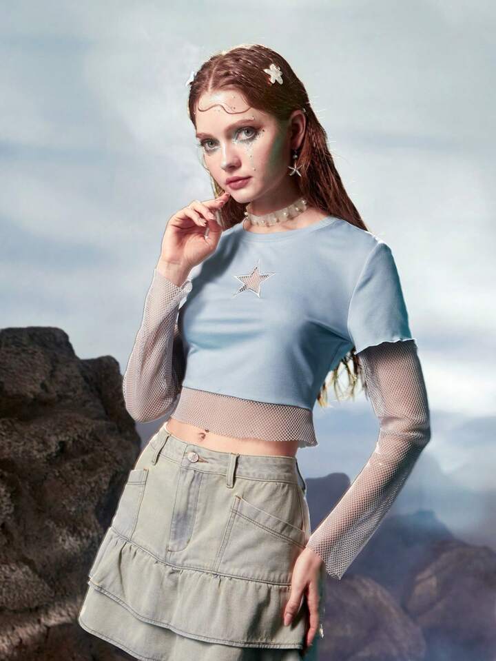 Fairycore T-shirt court 2 en 1 étoile découpé avec tulle