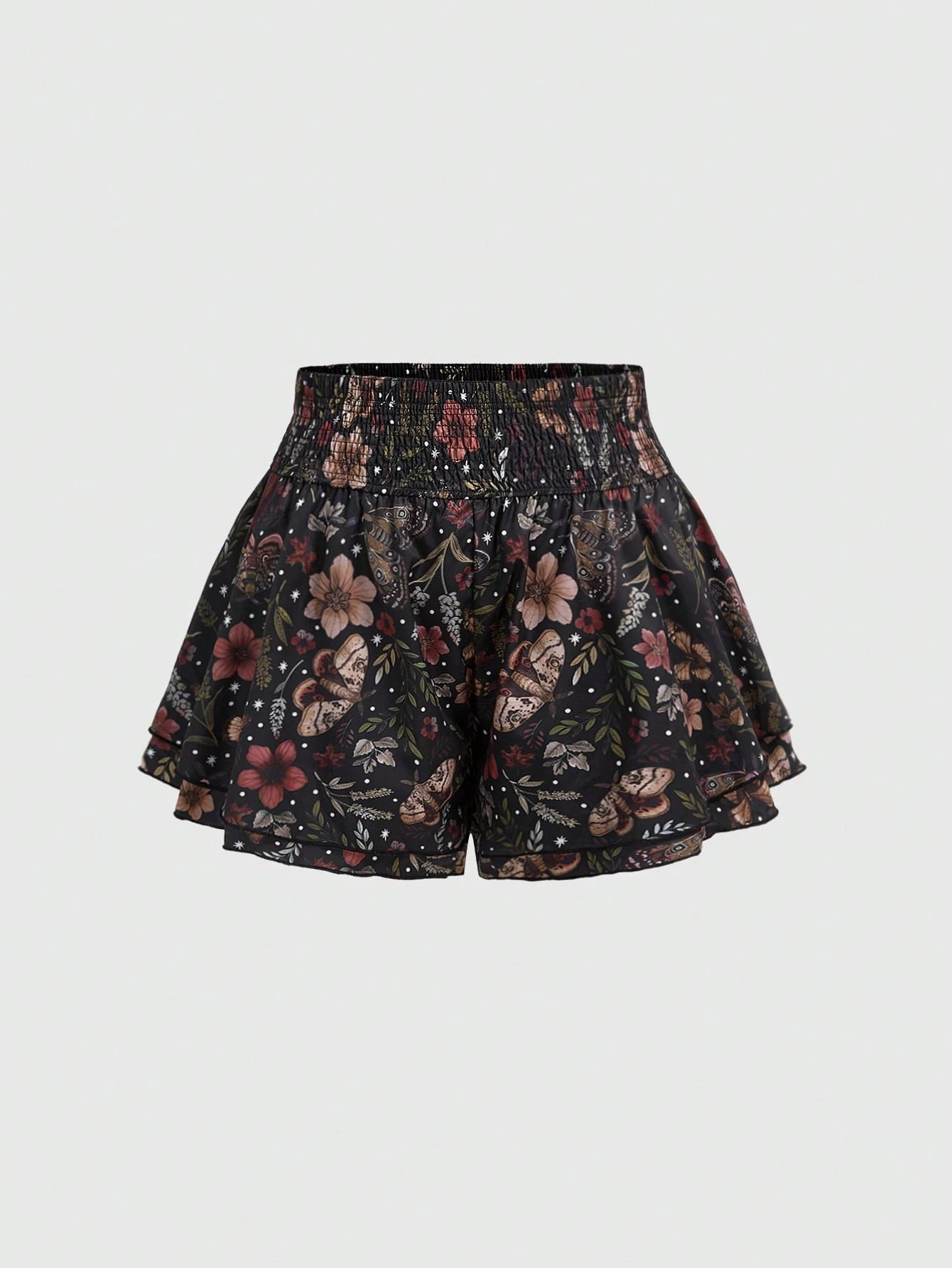 Fairycore Tenue d'été bohème, style hippie vacances, imprimé plante, jupe courte évasée à volants et short avec taille élastique, grande taille, pour femmes
