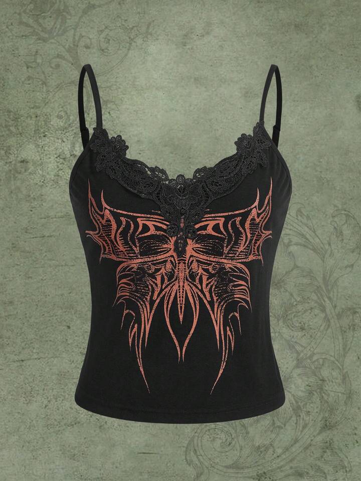 Fairycore Top À Fines Brides Imprimé Papillon En Dentelle