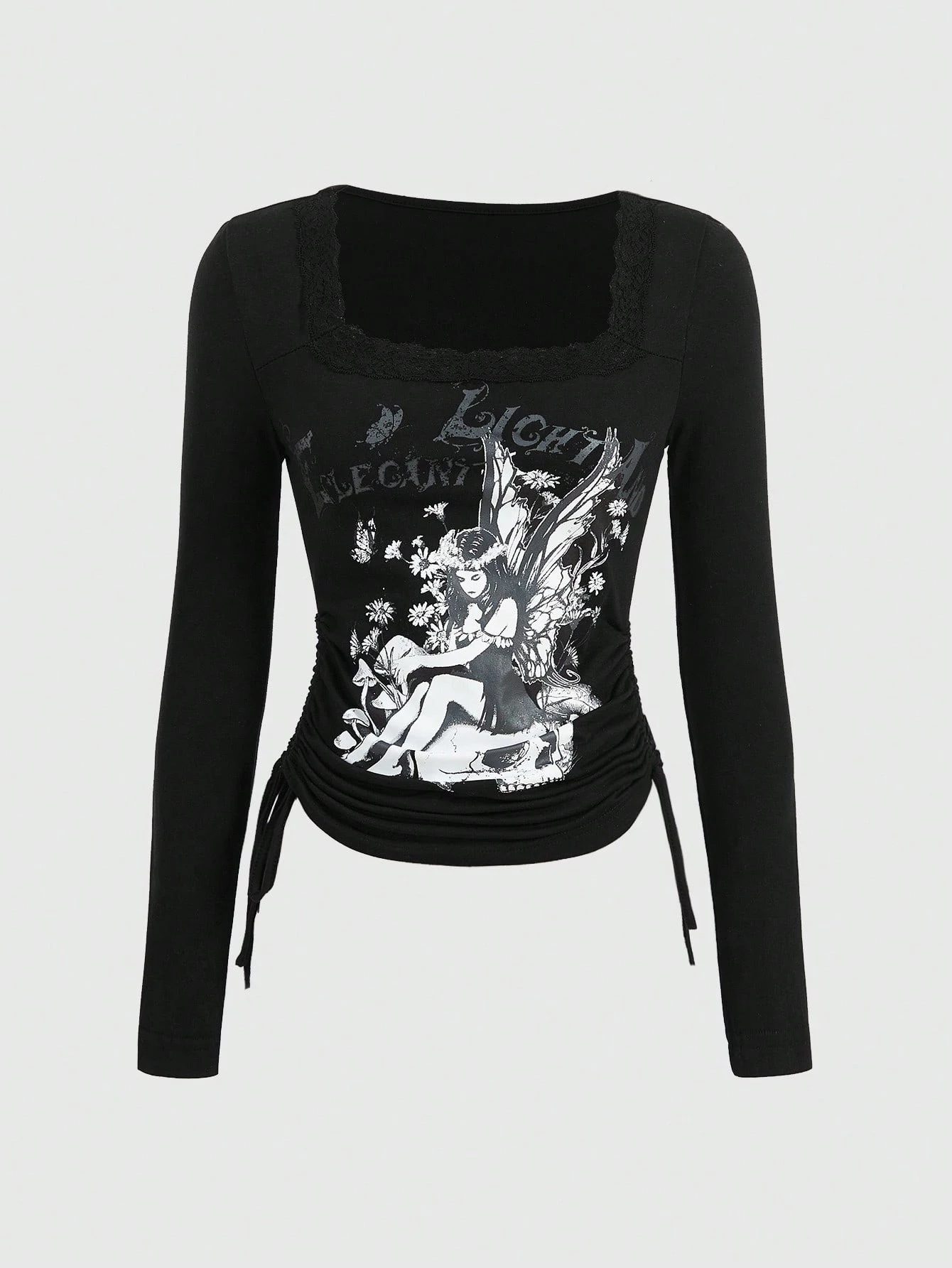 Fairycore T-shirt Avec Cordon De Serrage Latéral Imprimé De Caractères Et De Lettres