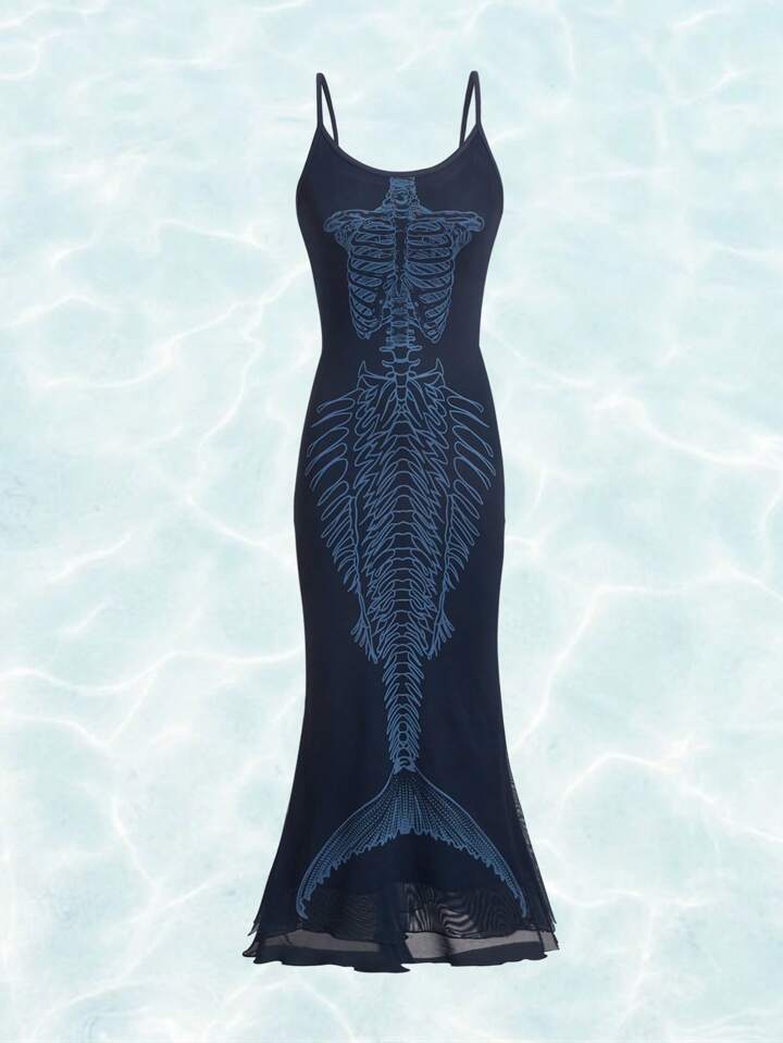 Fairycore Robe À Fines Brides Poisson Imprimé Squelette Sirène