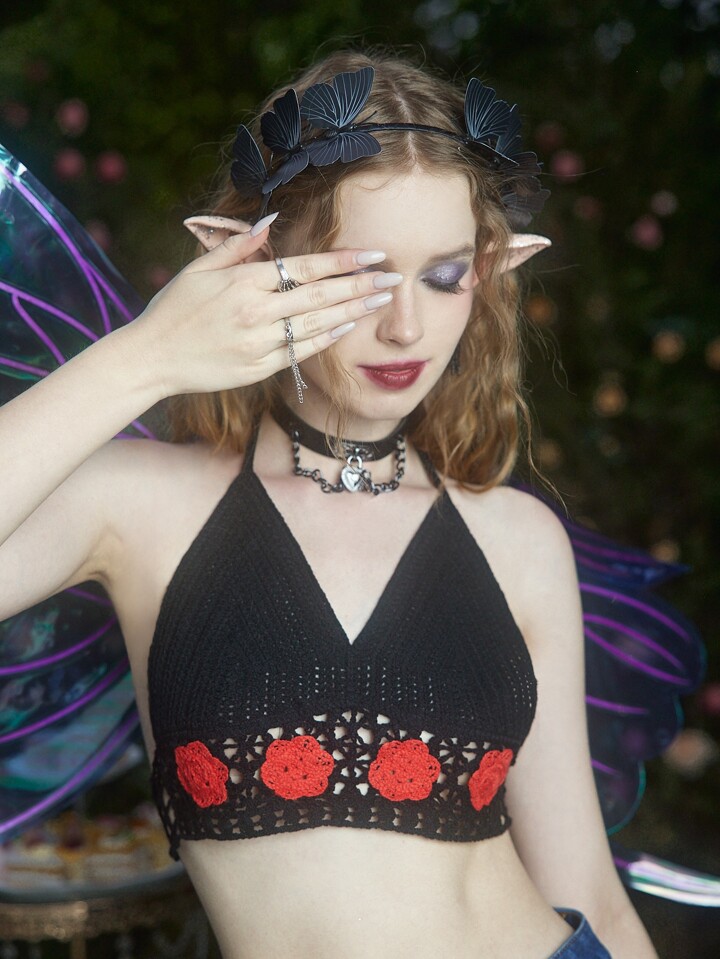 Fairycore Top en tricot fleuri en crochet dos-nu à nœud