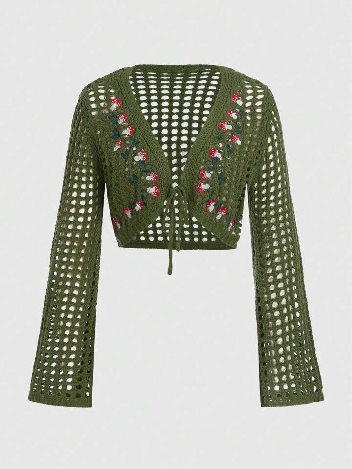 Fairycore Cardigan Brodé Fleur Ajouré À Nœud