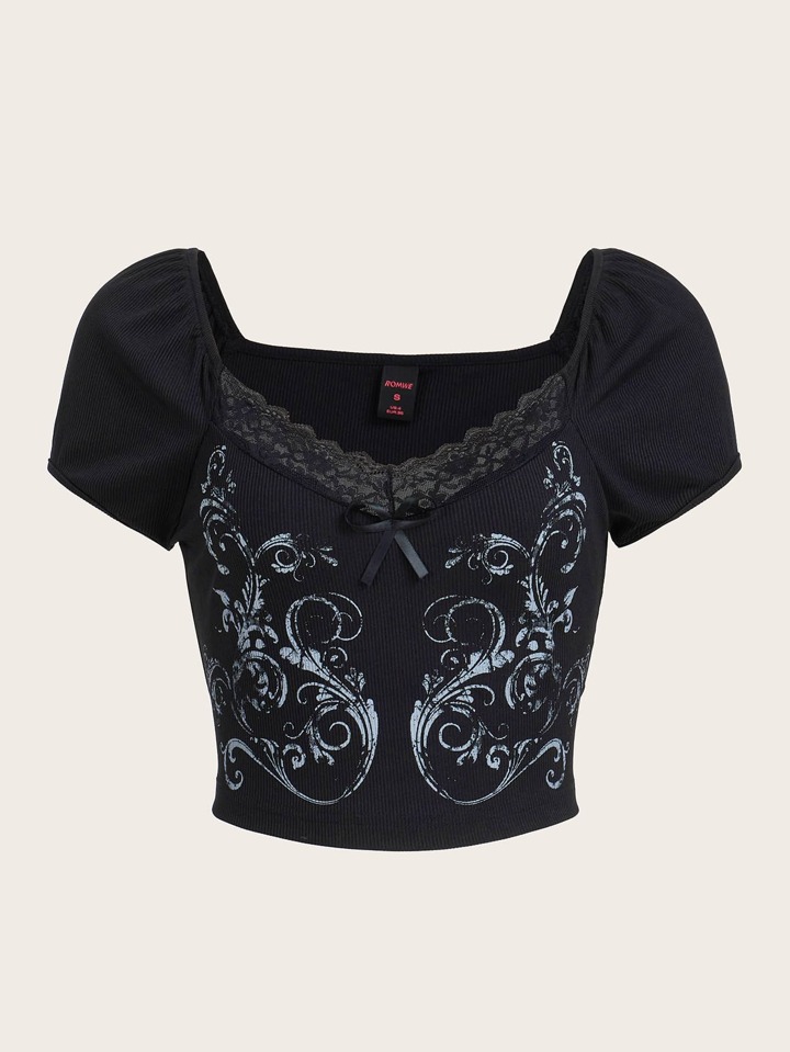 Fairycore T-shirt court à imprimé graphique en dentelle