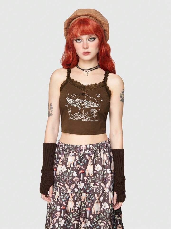 Fairycore Débardeur Pour Femme Avec Dentelle, Motif À Champignon Et À Escargot