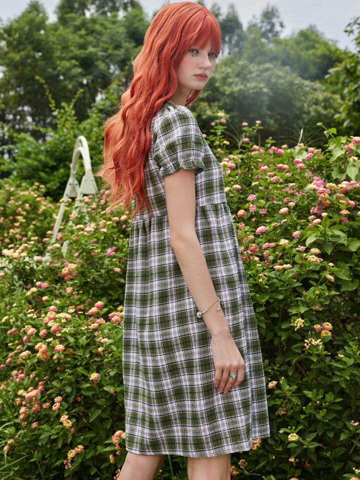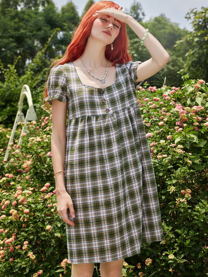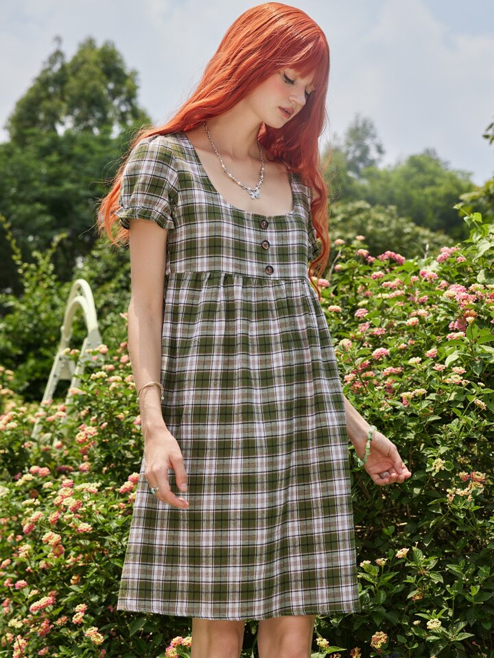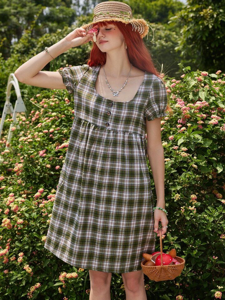 Fairycore Robe à carreaux à col carré manches bouffantes