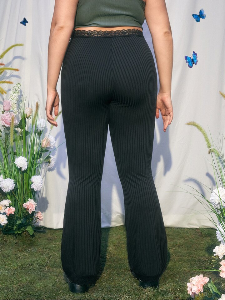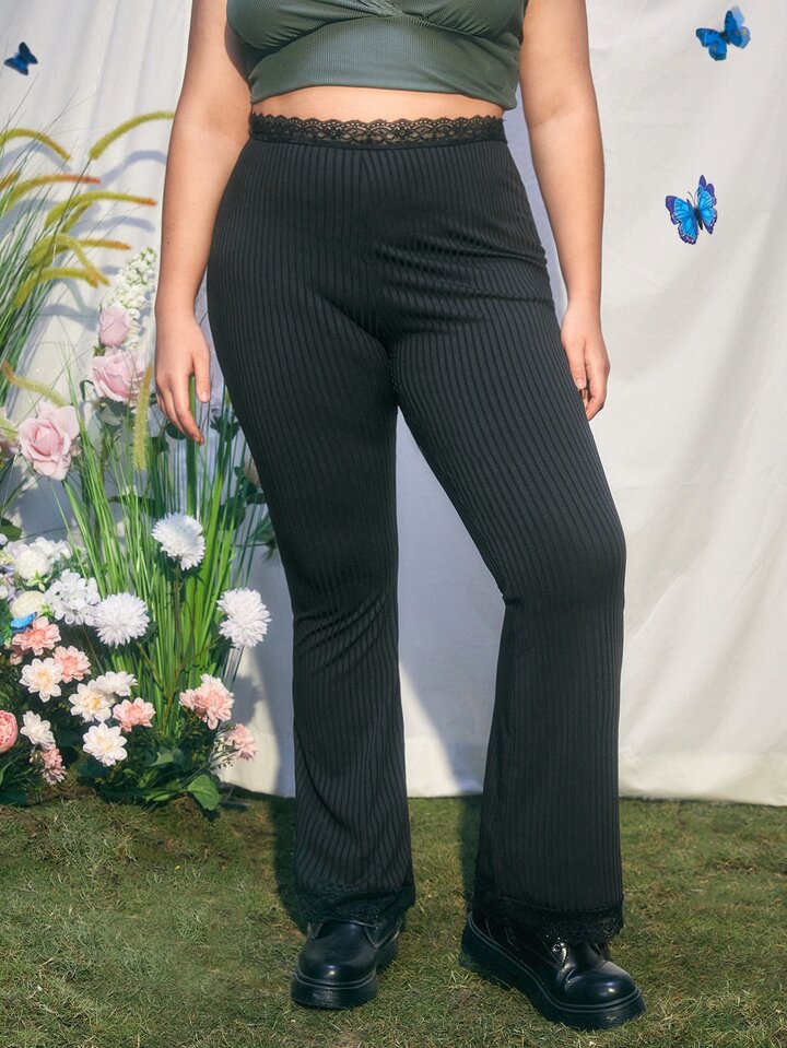 Fairycore Pantalons grandes tailles Dentelle contrastée Tissu côtelé Élégant Unicolore