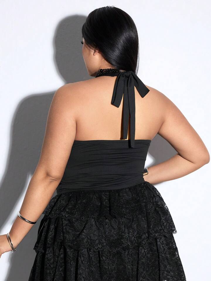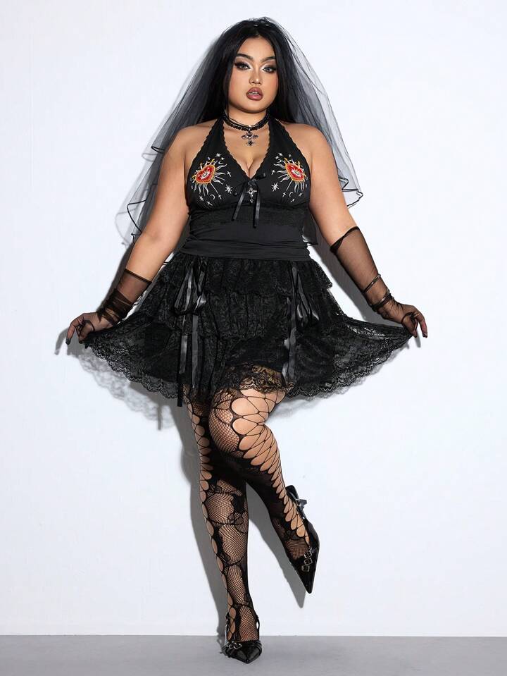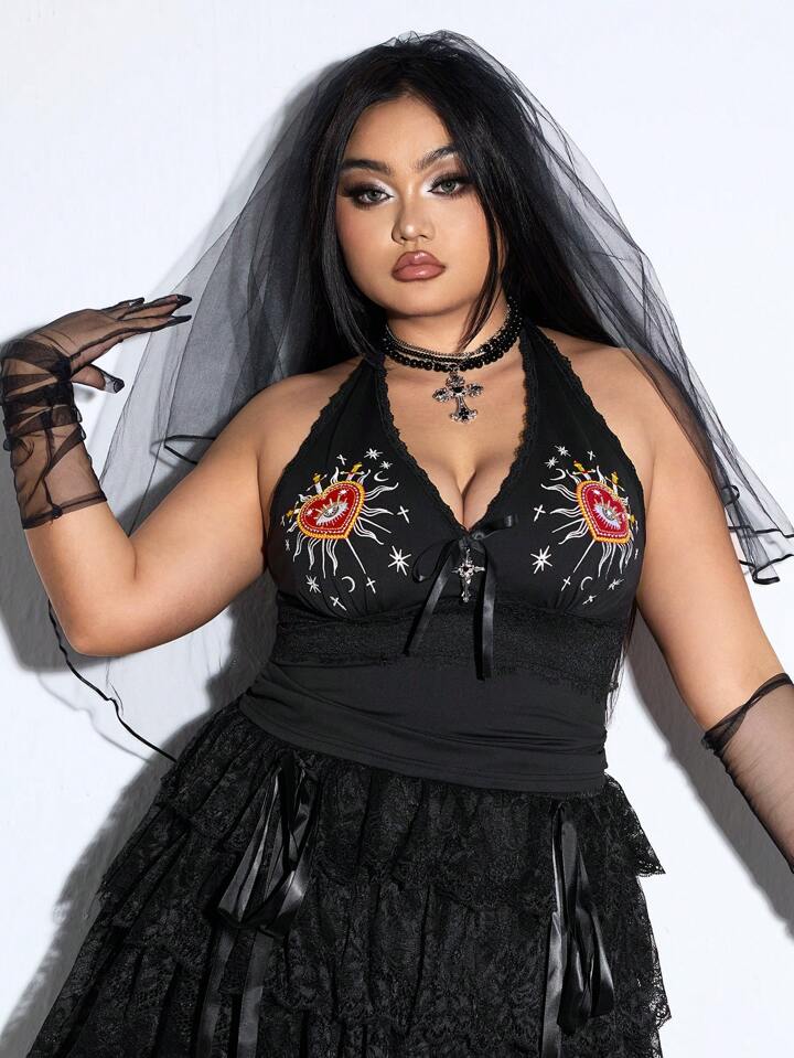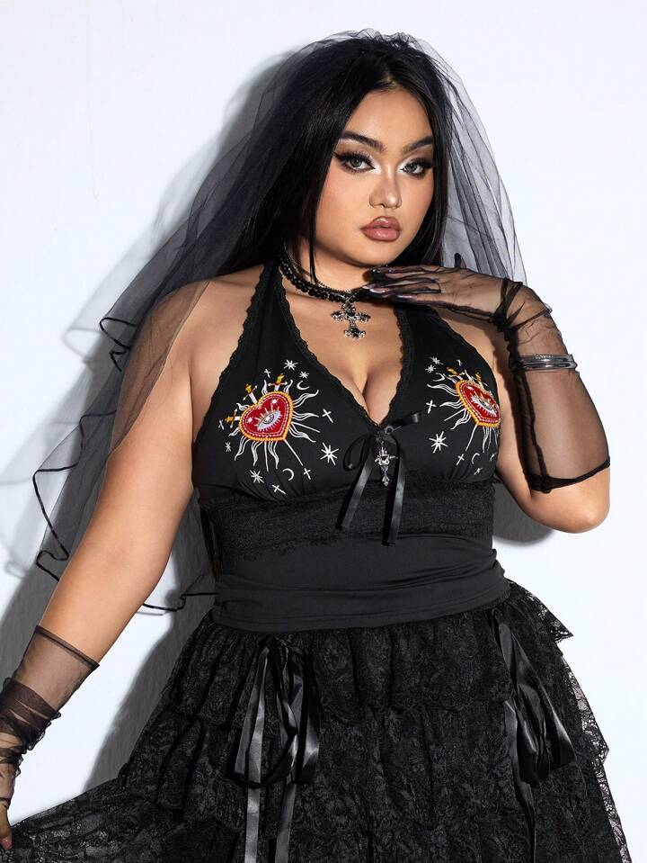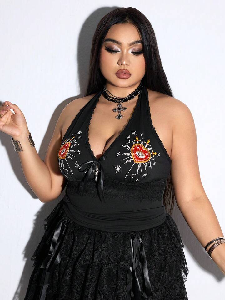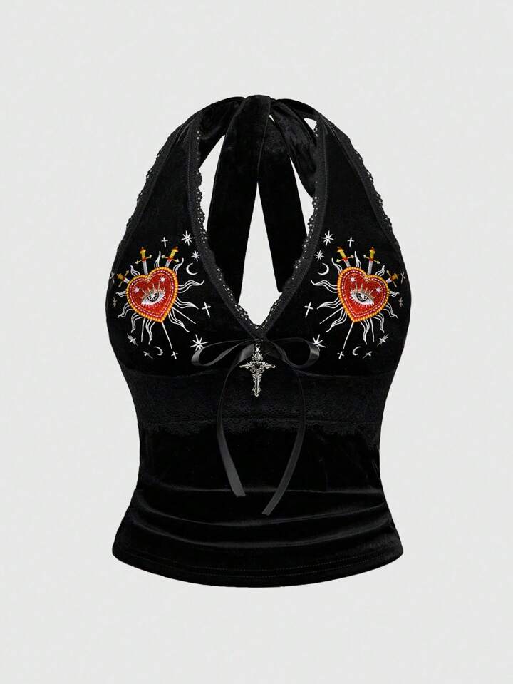 Fairycore Top dos nu ras-du-cou à col avec broderie en forme de cœur, grande taille, pour l'été, sexy