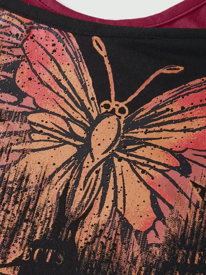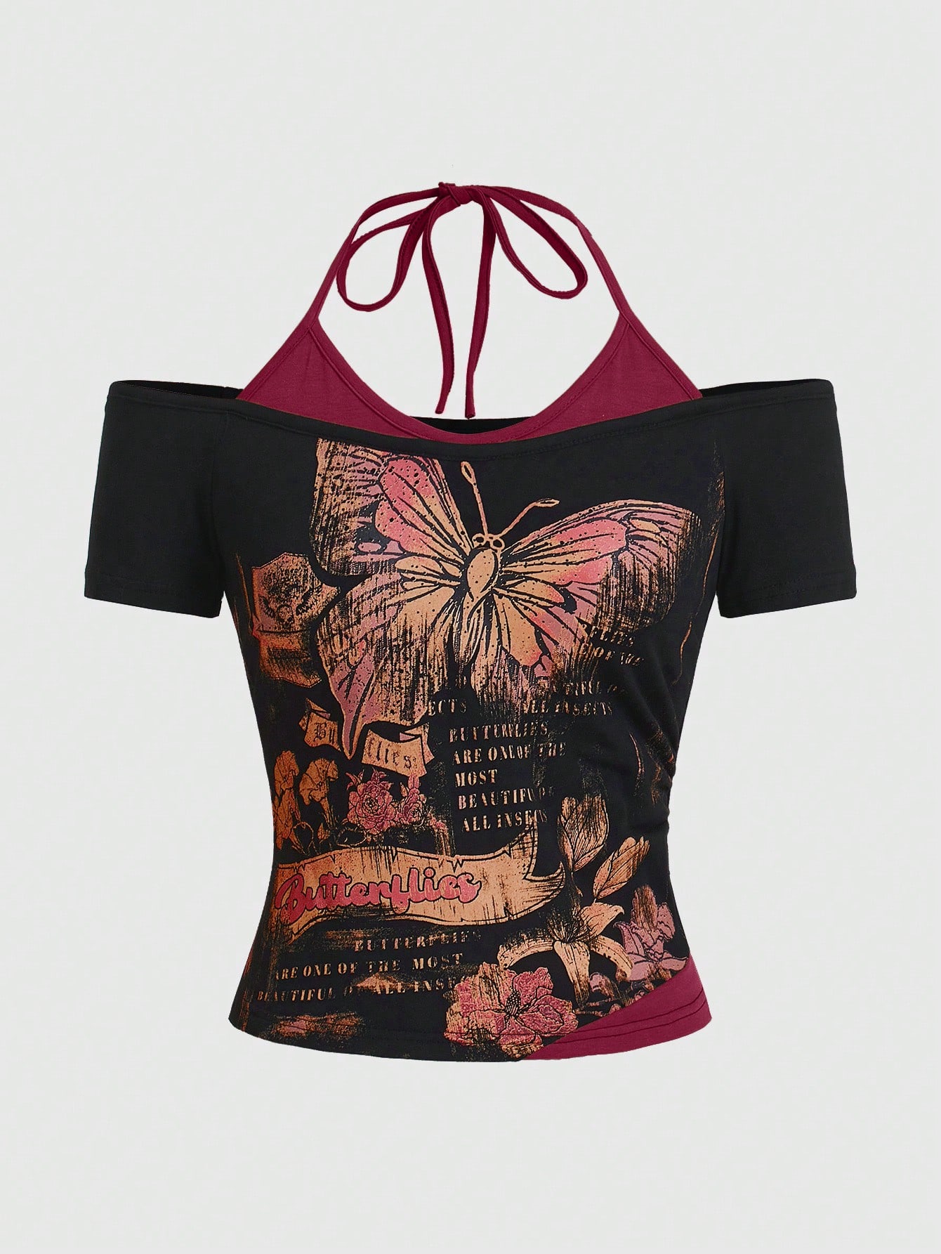 Fairycore Tee-shirt moulant femme avec épaules dénudées, imprimé papillon vintage et patchwork contrastant de style occidental