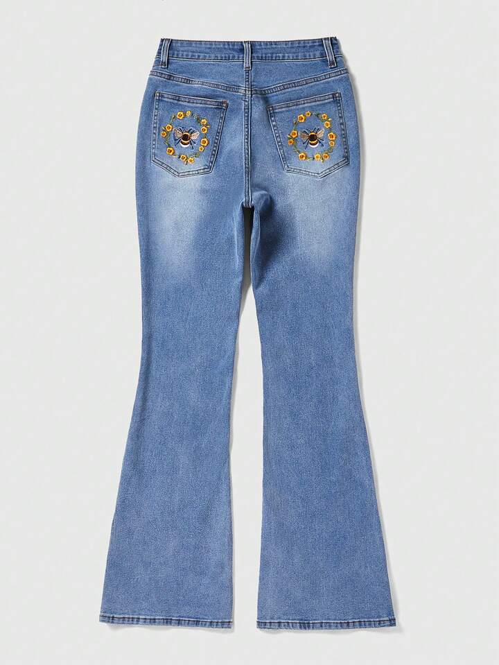 Fairycore Jean À Pattes D'éléphant Pour Femme Lavé À L'eau Avec Broderie D'abeille