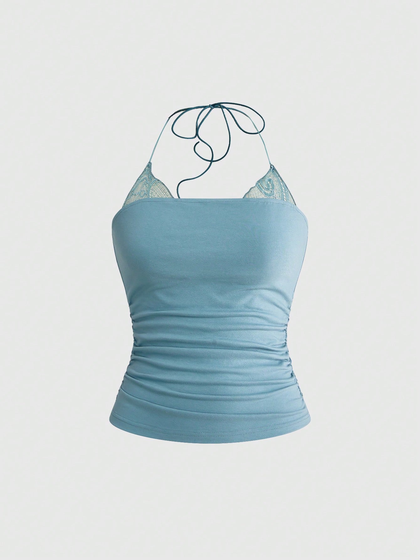 Fairycore Débardeur plissé à encolure ras-du-cou avec garniture en dentelle 2 en 1 pour femmes