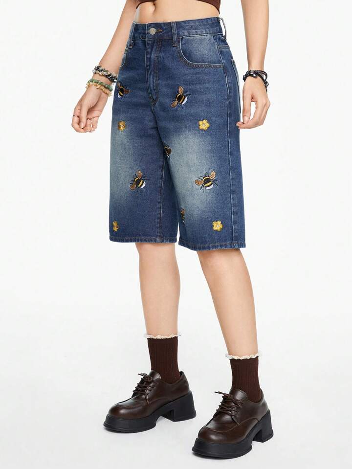 Fairycore Shorts en jean brodé pour femmes avec motif floral et d'abeille, shorts Bermuda