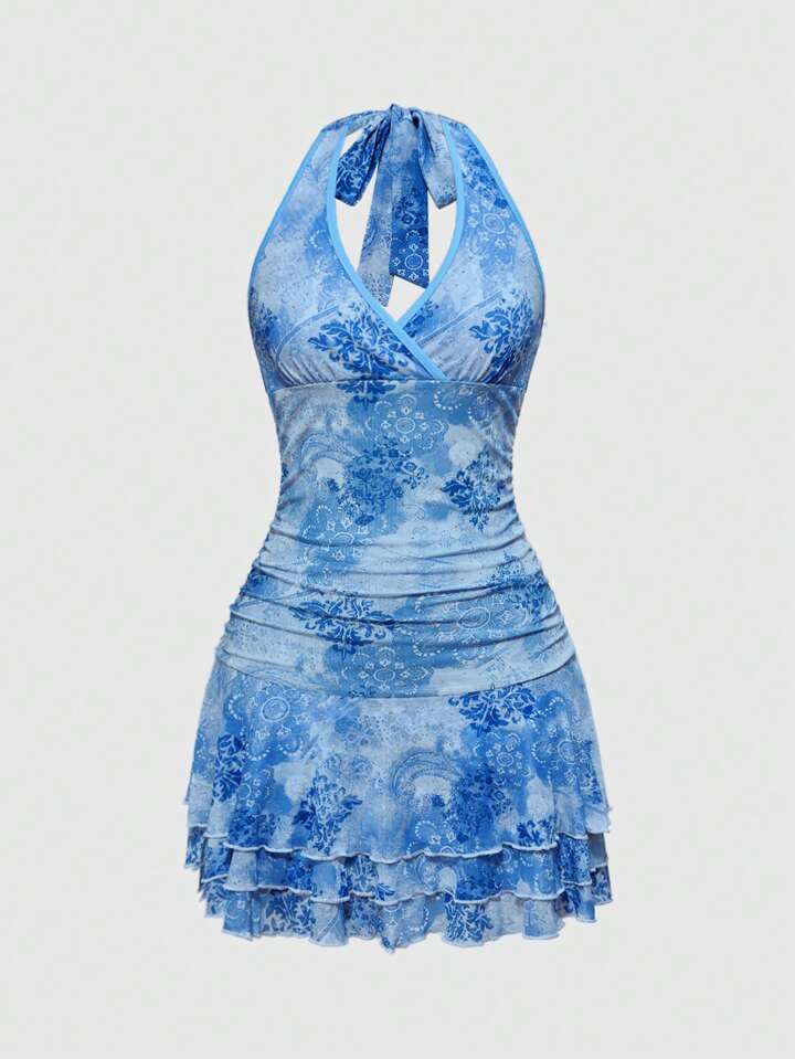 Fairycore Robe de vacances à col chale avec volants et imprimé floral pour femmes