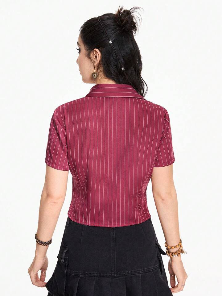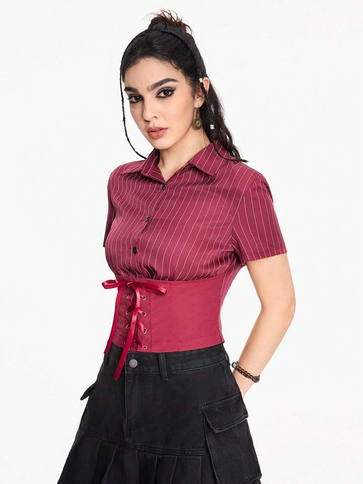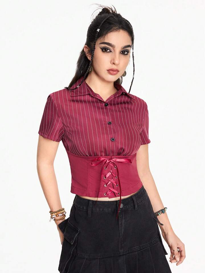 Fairycore Blouse décontractée d'été pour femmes à rayures, manches courtes, taille avec cordon, pour l'école