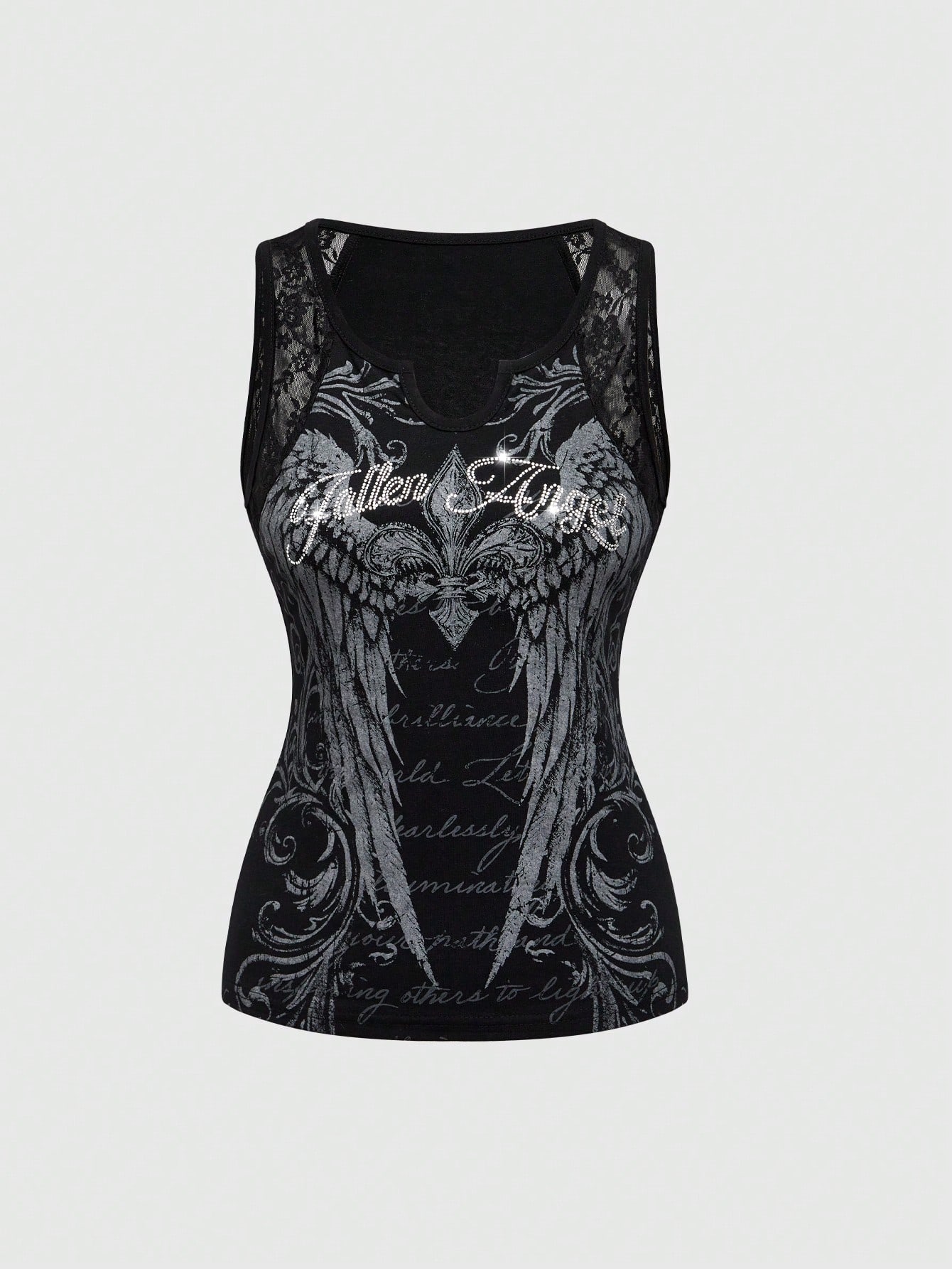 Fairycore Débardeur vintage style Y2K pour femmes avec patchwork en dentelle, imprimé croix et ailes, avec clous