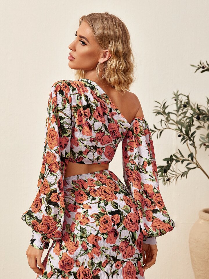 Top asymétrique fleuri à manches bishop