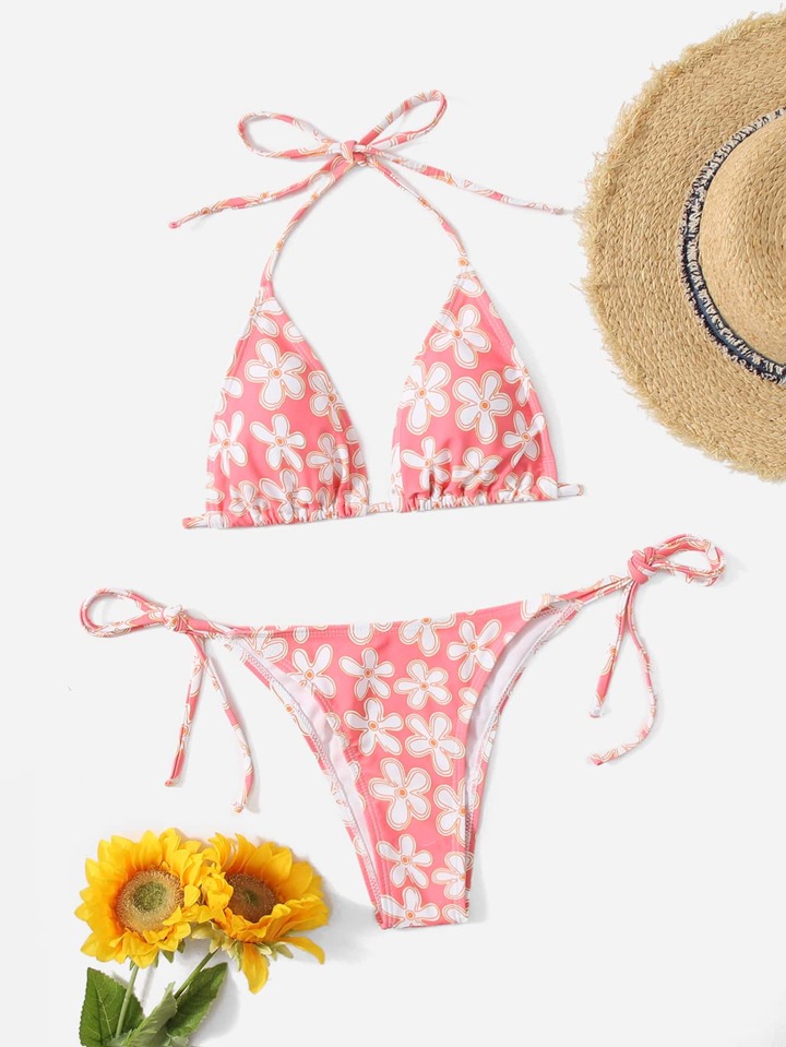 Bikini à nouer avec imprimé floral à col en ras-du-cou