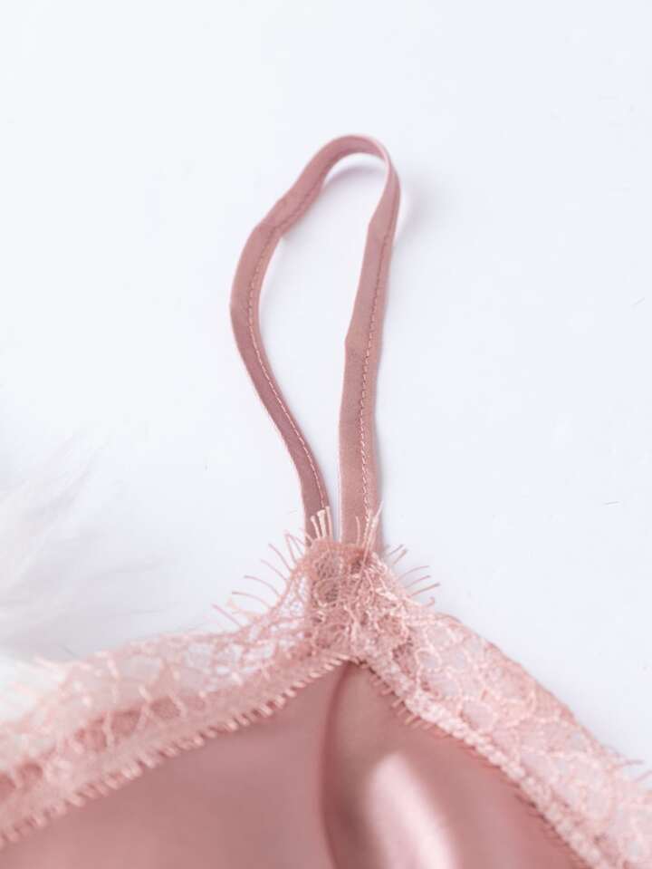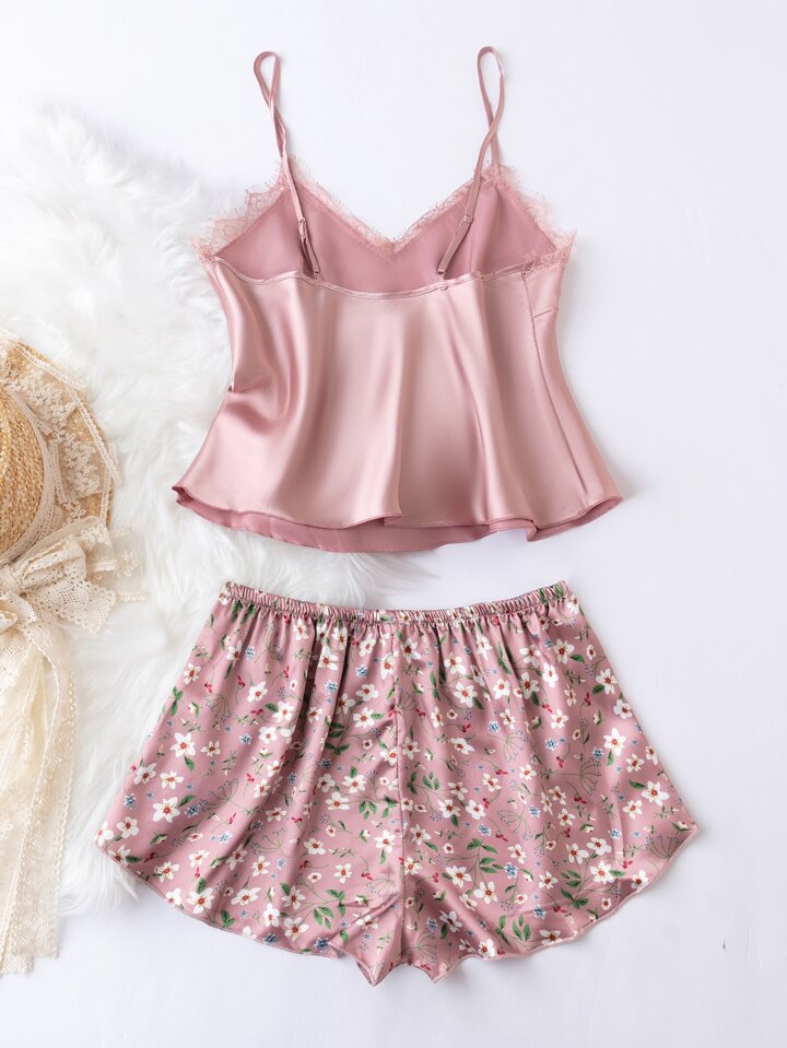 Ensemble pyjama en satin avec imprimé floral et détail de dentelle au nœud devant