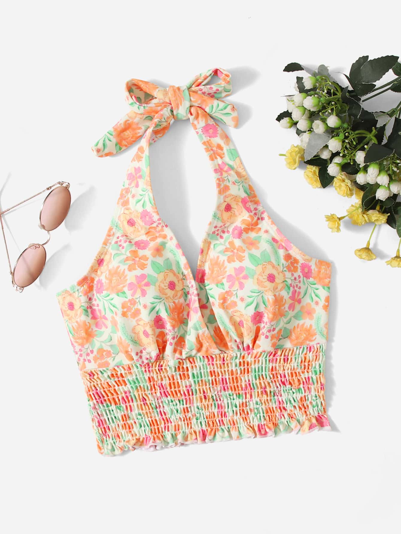 Haut de tankini à imprimé floral froncé ras-du-cou