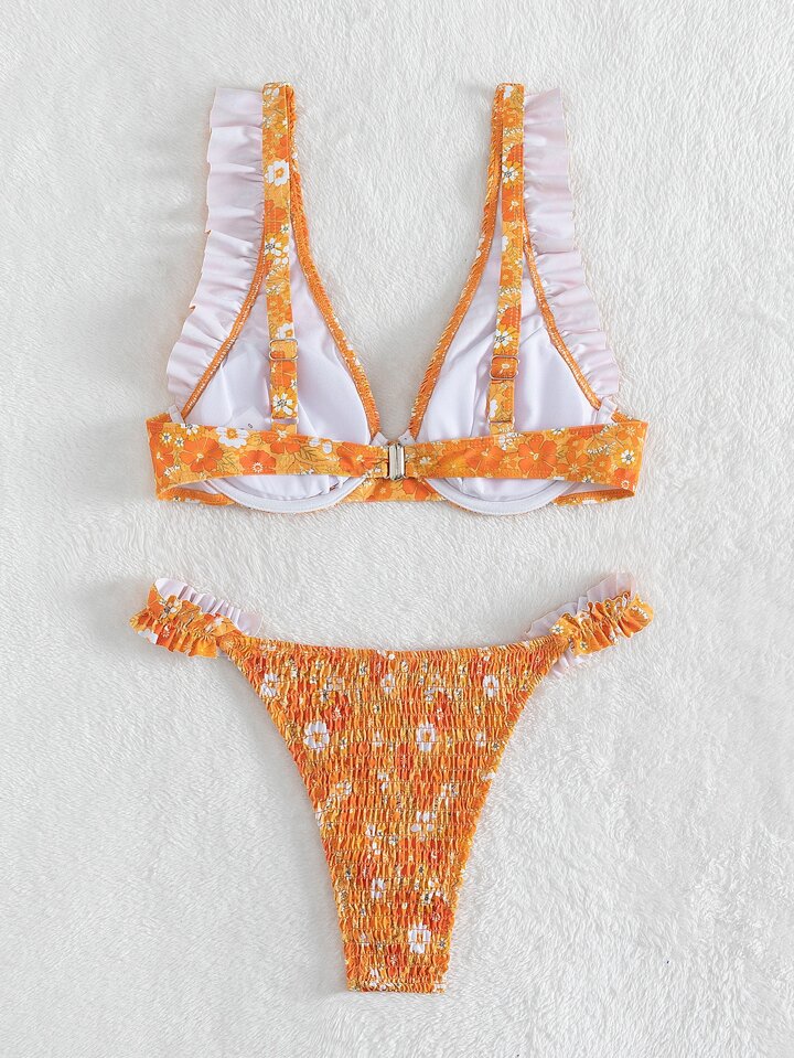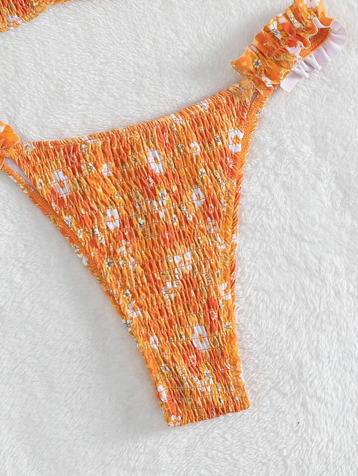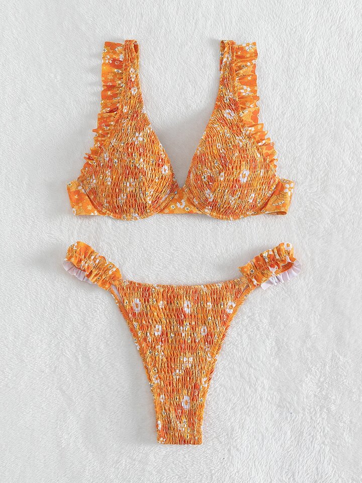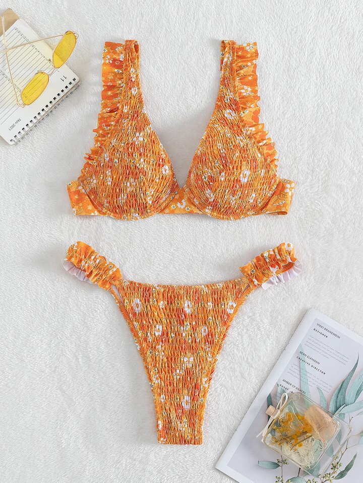 Ensemble bikini d'été imprimé floral à armatures smocké