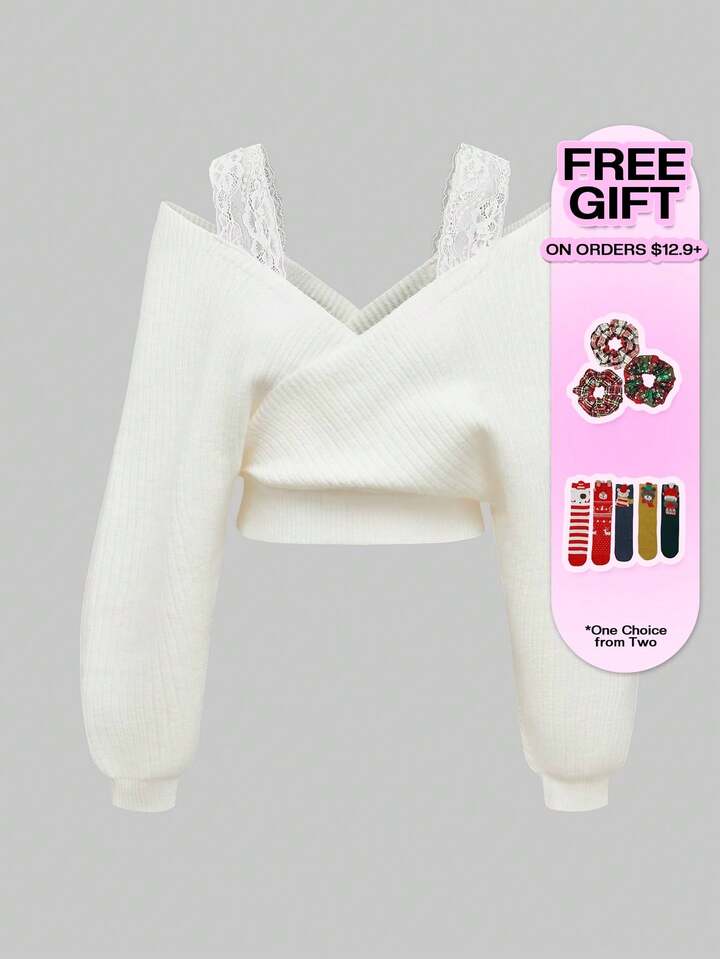 pull sexy décontracté à col V profond et épaules dénudées en dentelle