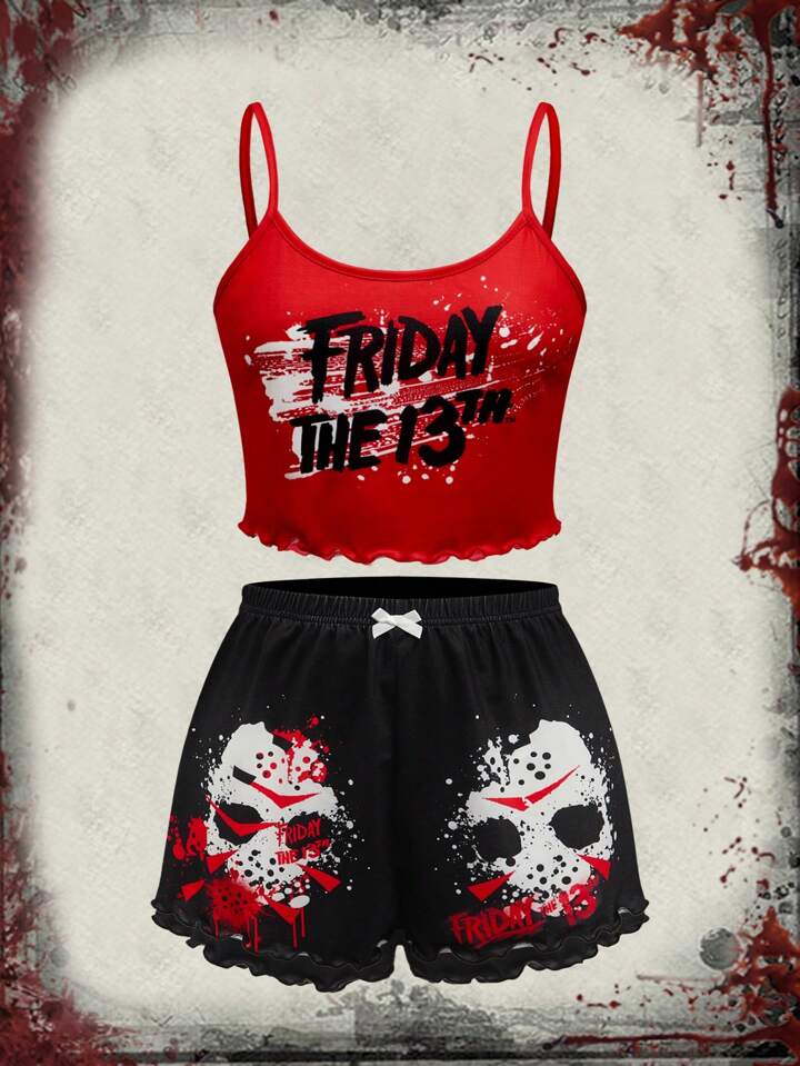 Friday the 13th X ROMWE Ensemble pyjama grandes tailles avec débardeur imprimé lettres et shorts