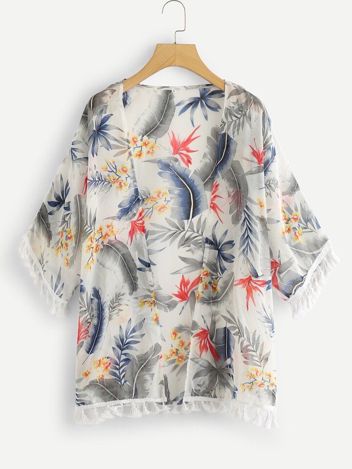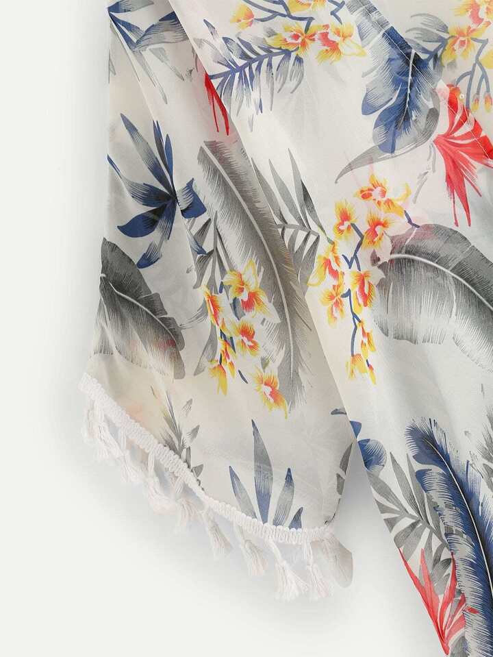 Kimono imprimé fleuri découpé avec frange