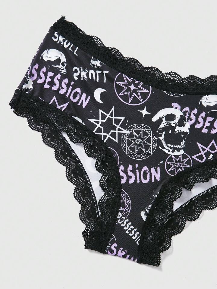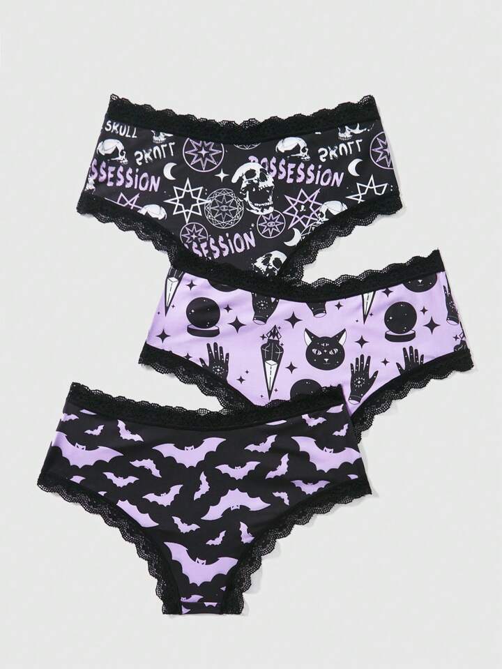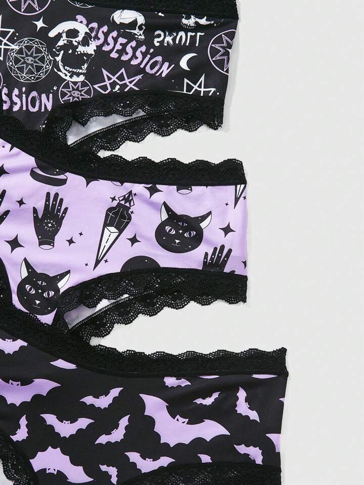 GUZLBT 3 Pièces Culottes Triangle À Bordure En Dentelle Imprimée Numérique Pour Femmes, Squelette De Chauve-souris, Lettres Et Chat Magique