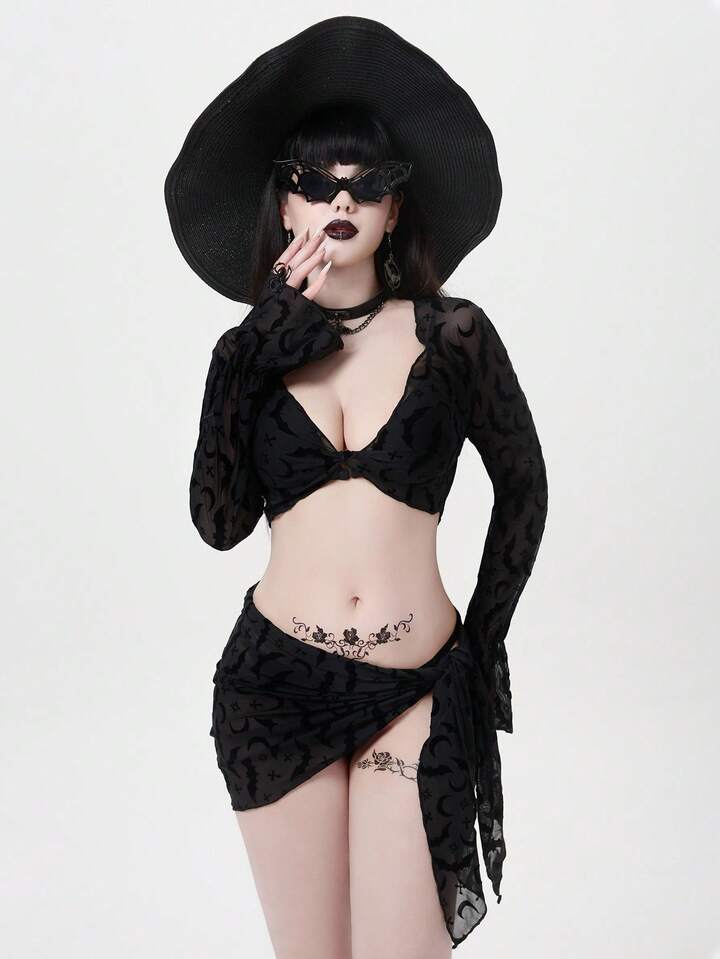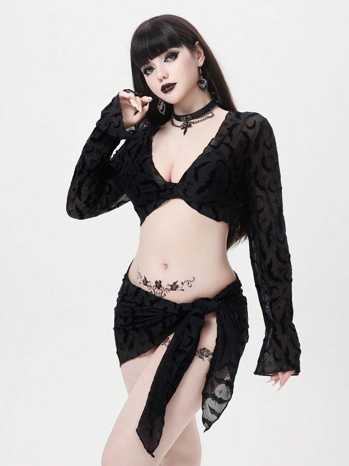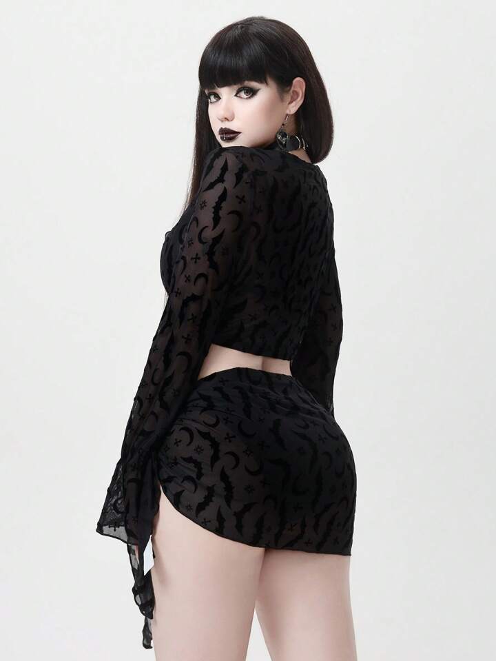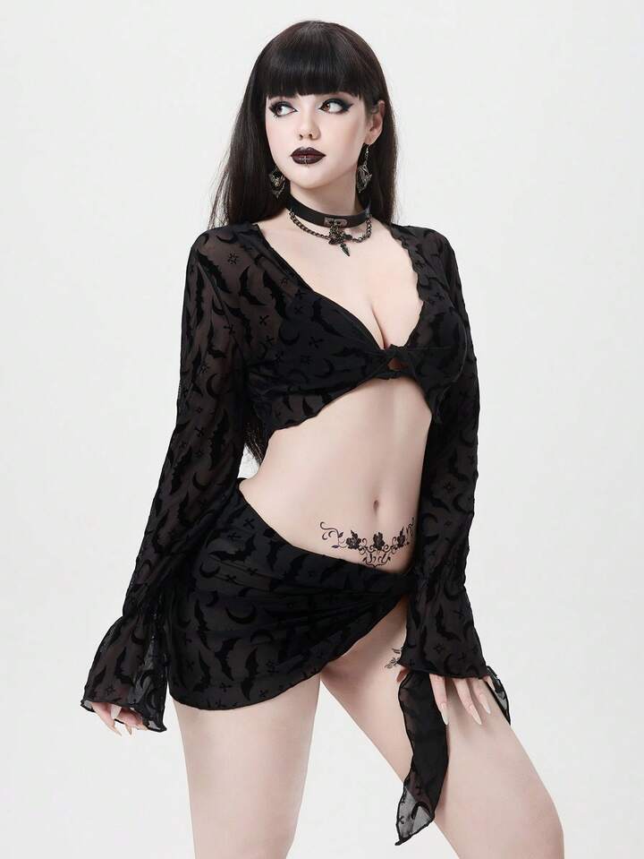 Goth 2 pièces Ensemble top court à manches évasées et mini-jupe pour femmes, en tissu floqué. Sexy et décontracté pour la plage, les fêtes, Halloween