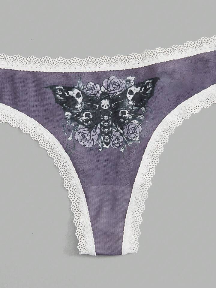 Goth 3 pièces Set De Culottes Tête De Mort Imprimé Floral En Dentelle