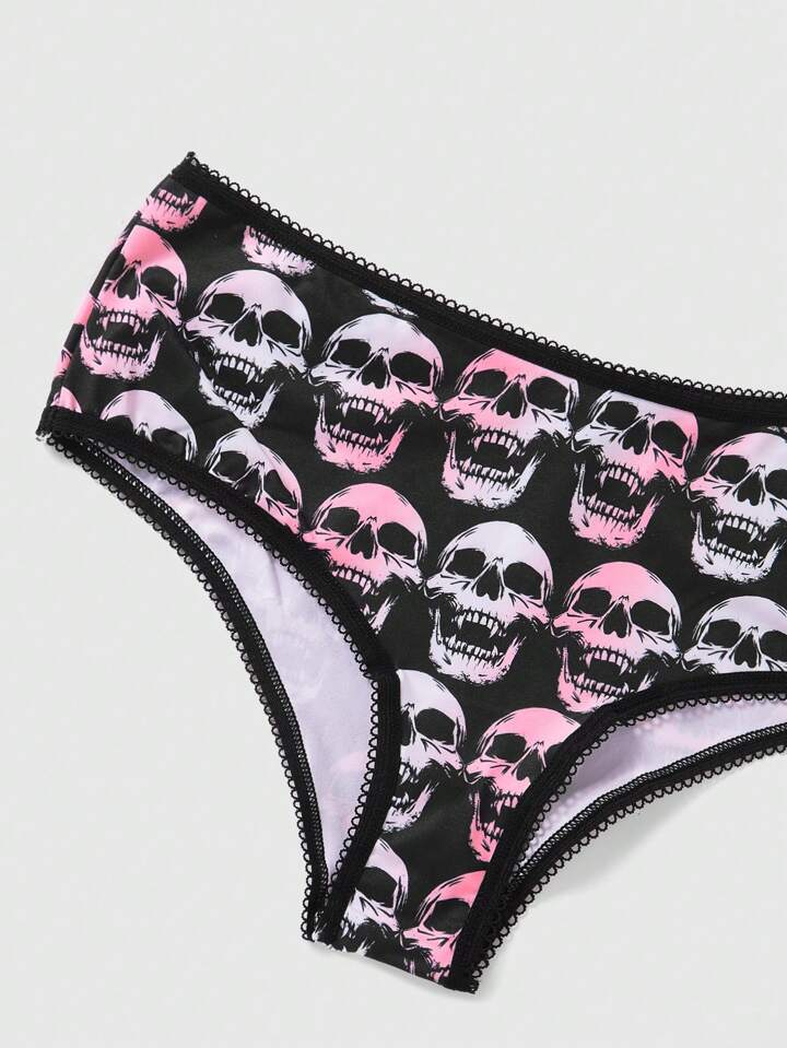 Goth 3 Pièces/ensemble Femmes Tête De Crâne D'araignée Imprimé Dentelle Florale Garniture String Sous-vêtements