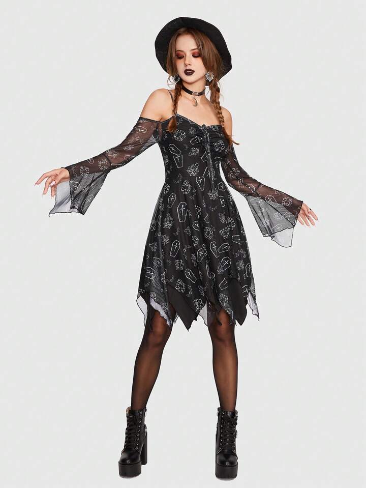 Goth Robe Imprimé À Épaules Dénudées Ourlet Hanky