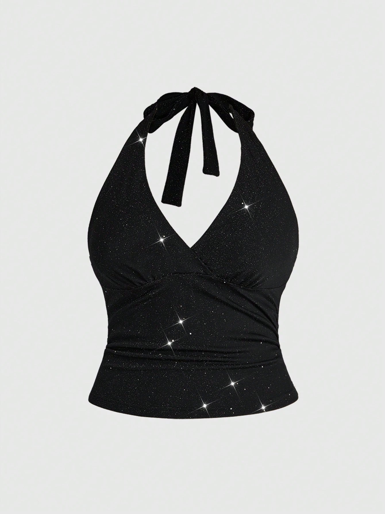 Goth Débardeur texturé brillant noir avec nœud papillon sans dos, top élégant et sexy grande taille pour femmes, avec bretelles spaghetti plissées