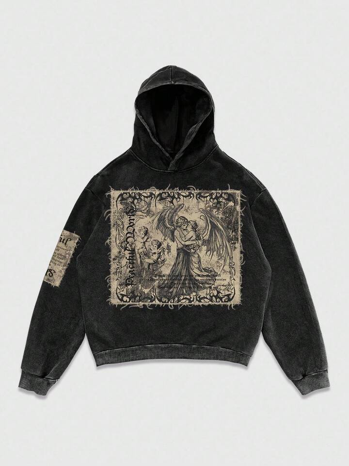 Goth Sweat-shirt à capuche sans poche pour hommes, personnage religieux lavé à l'acide noir